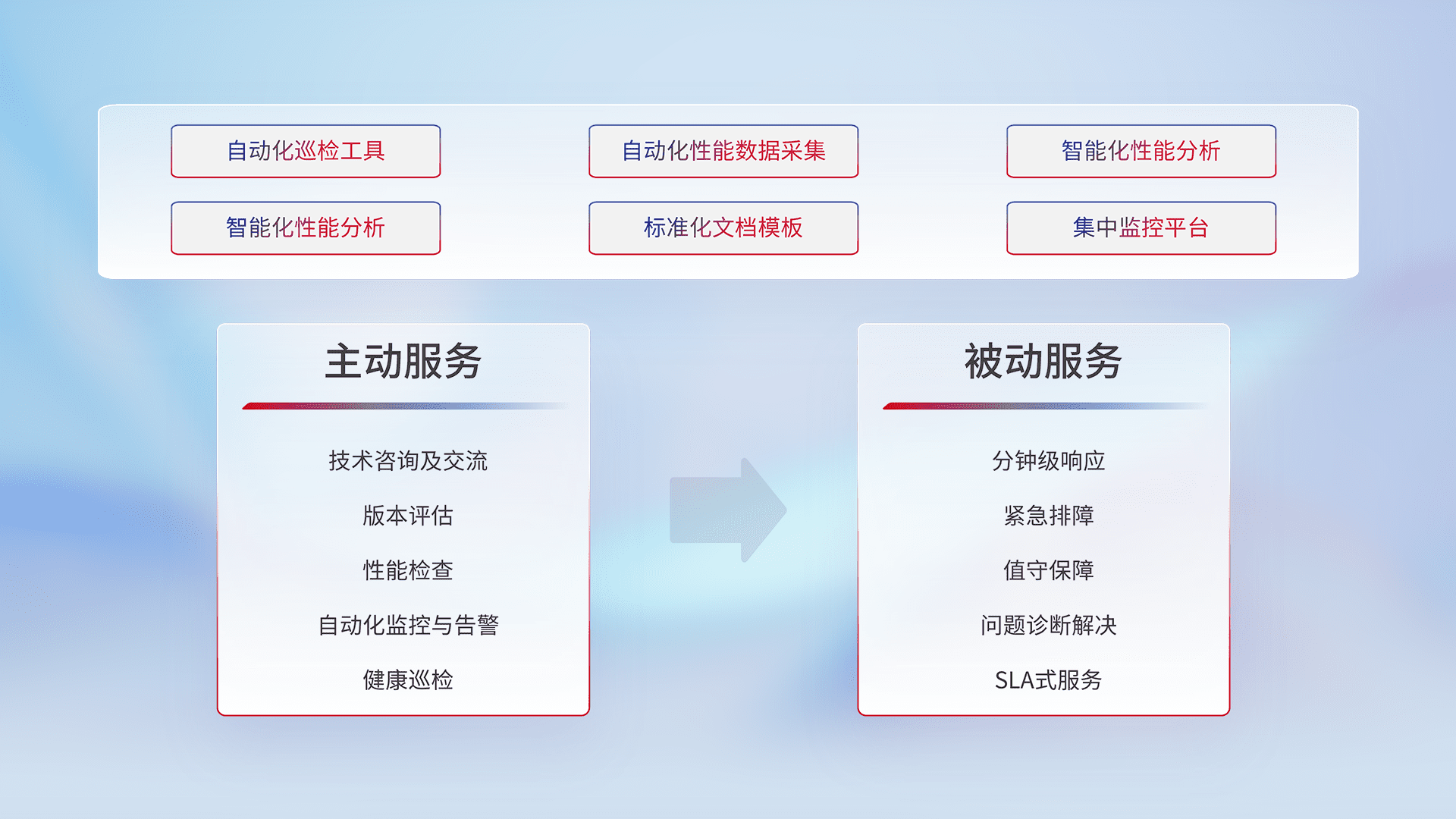智能化工具和标准化文档,,保障服务质量,,提供主动服务(包含技术咨询、、、、版本评估、、、、性能检查、、自动化监控与告警、、、健康巡检)和被动服务包含(分钟级响应、、、紧急排障、、值守保障、、、问题诊断解决、、、SLA服务)。。