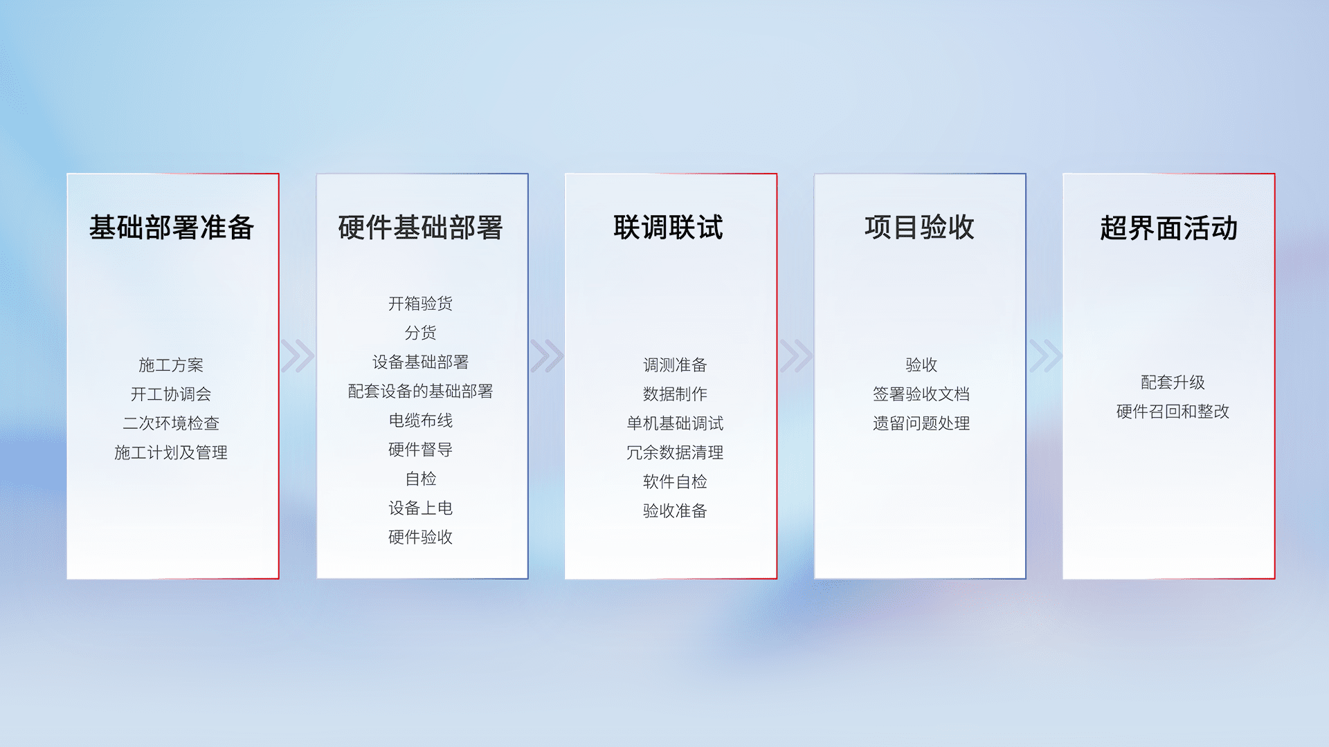 从基础部署准备、、、硬件基础部署、、联调联试、、、项目验收、、、越界面活动的全过程可追溯,,,,保证施工质量和进度。。。。